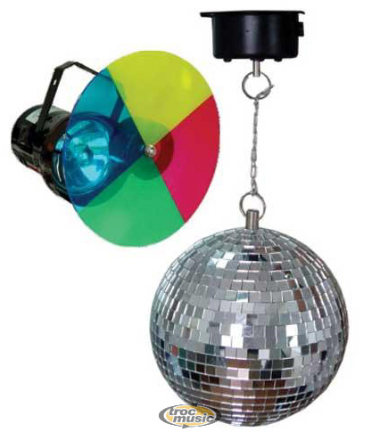 Disco Set 8''/20cm Miror Disco3. Projecteur PAR36 + lampe. Disque rotatif de couleurs + moteur. Boule à facettes 8''/20cm. Moteur pour boule à facettes (230V).