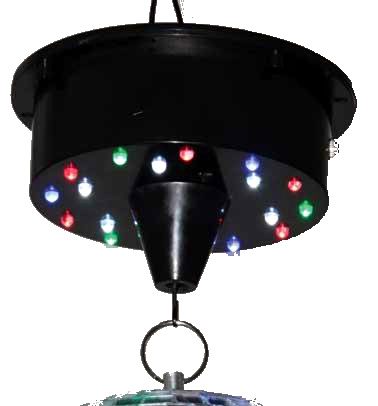 | Moteur équipé de 18 LED multi couleurs qui éclairent la boule à facettes tout en assurant sa rotation. Polyvalent et autonome, il est alimenté par 3 piles R6 de 1,5V (non fournies) ou sur le secteur au moyen d'une alimentation 220V-4,5V (réf. MBM-TRANSFO en option). Avec crochets de suspension au plafond et pour la boule. Interrupteur M/A. |