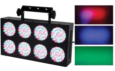 Effet de lumière DMX à Led RVB 8-EYES. DMX-512 à 13 canaux. 8 x 24 LED RVB de ֠10mm. 4 modes de fonctionnement : DMX, automatique, Maître/Esclave et commandé par la musique. Système LINKABLE. Faible encombrement.