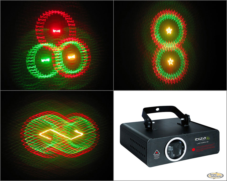 | Laser graphique qui génère des effets 3D intégrés ou personnalisables tels que des images, animations, tunnels, etc. Convient aux discothèques, clubs, pubs, bars et salles des fêtes. 10 canaux DMX. Fonctionnement automatique, contrôlé par le son, DMX et Maître/Esclave. Sélection des gobos et des couleurs. Couleur jaune par superposition R + V. Séparation R & V en DMX pour les effets. 45 motifs différents. 50 gobos transformables en effet 3D. Panneau de contrôle avec afficheur digital à . |