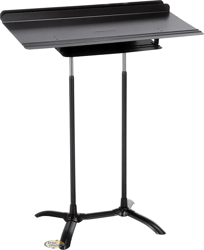 | Dimension de la table : largeur 81cm, hauteur 38cm. Tige réglable de 71cm à 127cm (160cm avec la table). Conçu pour les besoins des chefs d'orchestre, ce pupitre à double pied est extrêmement stable. La table plus large accueille les partitions de grand format et le double support permet de ranger une multitude d'accessoires, sans compter une pochette de rangement supplémentaire à l'arrière du pupitre. |