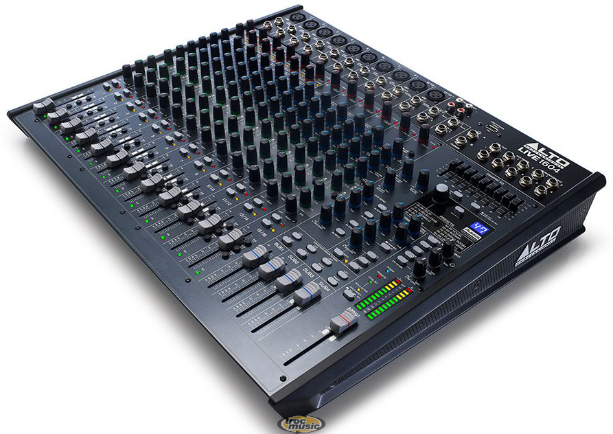 Table de mixage 12 canaux et 2 bus. 7 entrées XLR avec pré-amplis micro DNATM. Alimentation fantôme. Compresseurs dynamiques. Egaliseur 3 bandes.