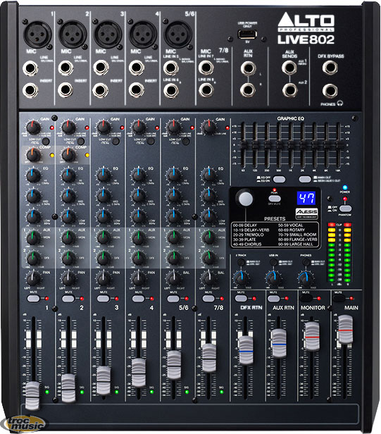 Table de mixage à 8 canaux et 2 bus. 5 entrées XLR avec pré-amplis micro DNATM. Alimentation fantôme. Compresseurs dynamiques. Egaliseur 3 bandes.