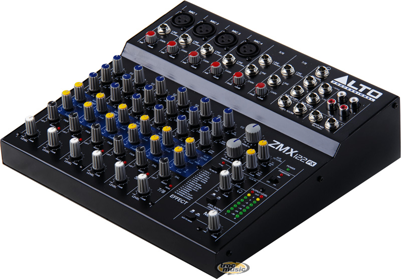 | Mixeur 8 voies avec un total de 12 entrées. 2 voies avec entrées XLR et jack 6,35 mm symétriques, contrôle du gain et alimentation fantôme. 2 voies avec entrées mono/stéréo jack 6,35 mm et contrôle du gain. Eq 3 bandes par canal. Diode témoin de saturation par tranche. 2 départs auxilliaires pré-fader pour contrôle des effets et du monitoring. Entrées et sorties AUX en RCA. Sorties Main, Control Room et casque en jack 6,35 mm. Processeur d'effets 24 bit, 256 mémoires. Dimensions : 256 x 250 x 72 mm, poids : 2,3 kg. |