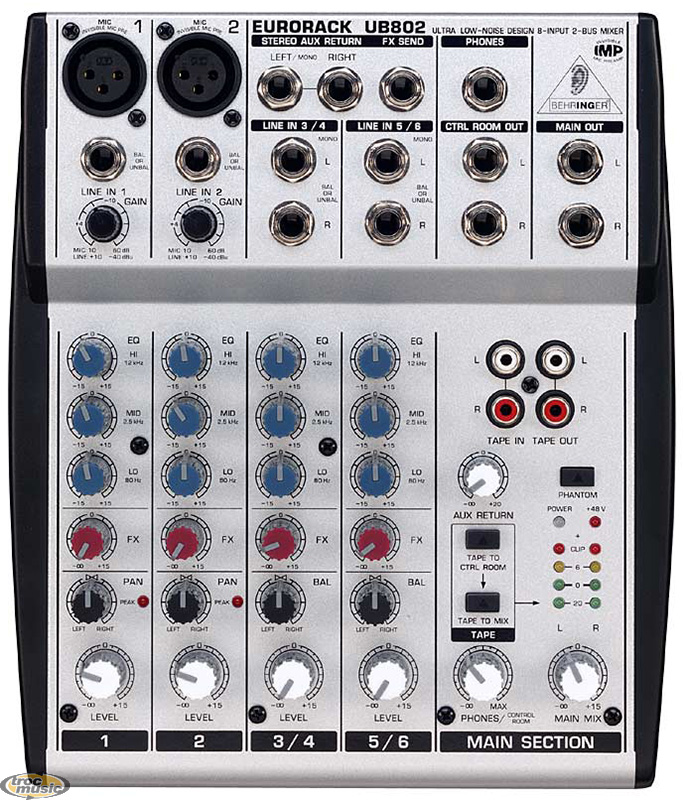 Console micro/ligne avec 8 entrées et 2 bus. Préamps micro IMP Invisible avec alim 48V. égaliseur 3 bandes.