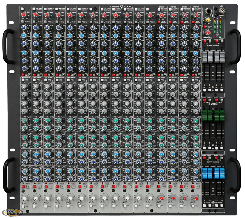| Console retour 20 voies rackable, 10U. 12 Entrées Micro/Ligne mono + 4 entrées stéréo. 1 entrée commune assignable à tous les Aux (Clic par exemple). Splitteur intégré sur les entrées XLR, avec switch de coupure de terre individuel. Alimentation fantôme, Coupe-bas sur toutes les entrées. Egaliseur 4 bandes, semi paramétrique bandes médium. 12 départs auxiliaires (Aux 1 à 4 commutables pré fader). Faders rotatifs sur les entrées et de 60mm sur les généraux d'Auxiliaires. |