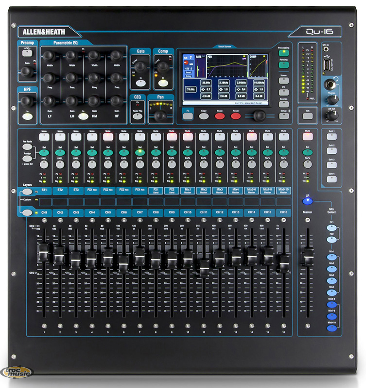 16 entrées mono, 3 entrées stéréo, 16 Bus. Préamplis Analogiqtm, Ecran tactile 800x480. Fader motorisé. Compresseur et délai sur chaque entrée, Bibliothèque d'effets iLive FX.
