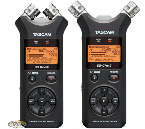 | Le DR-07MKII est un enregistreur stéréo portable de haute qualité, travaillant sur carte microSD ou microSDHC, en haute résolution audio (jusqu'` 24 bits/96 kHz) - sur carte micro SD ou micro SDHC. Le couple de micros cardioïdes intégrés encaisse un niveau de pression sonore maximal élevé. Le DR07MKII permet aussi de connecter un micro stéréo séparé, ou une source de signal au niveau ligne, via son entrée stéréo sur mini-jack. |