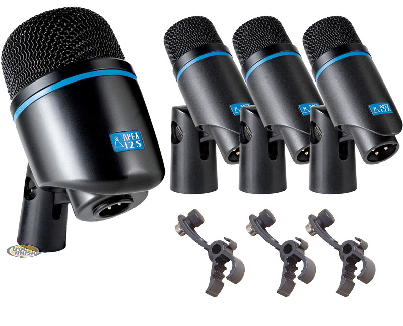 Kit micros batterie composé de microphones dynamiques pour la prise de son où il n'est pas nécessaire de reprendre les cymbales (ou ambiance) mais uniquement une grosse caisse, une caisse claire et 2 toms par exemple. Cet ensemble comprend : 1 x APEX125 et un 3 x APEX126 avec fixation.