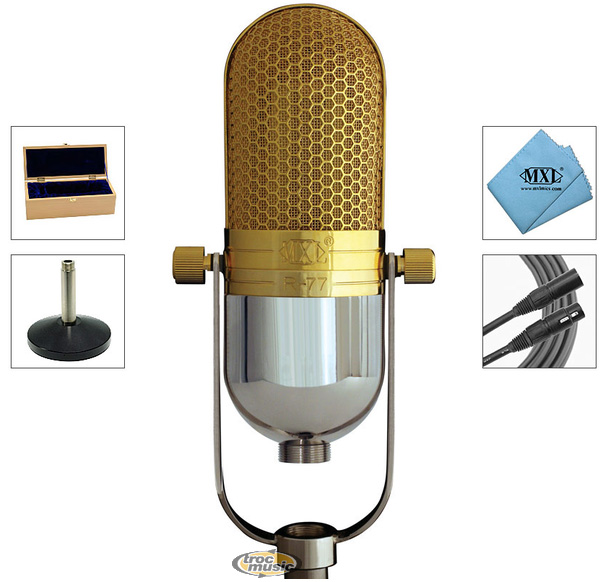 Le MXL R77L est un micro à ruban équipé d'un transformateur Lundahl d'une finition en métal chrome et dorée irréprochable. Ribbon Element : 1.8-micron aluminum ribbon. Frequency Range : 20Hz -18kHz. Polar Pattern : Figure 8. Sensitivity : -55 dB (0 dB=1V/Pa). Impedance : 270 ohms. Rated Load Impedance : >1500 Ohms. Max SPL for 0.1% THD : >135 dB @1 kHz. Size : 65mm x 180mm/2.56 in x 7.09 in.