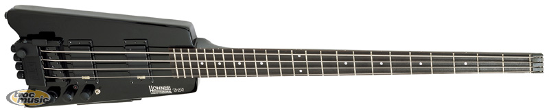 Basse électrique sans tête. Corps érable. Manche conducteur érable. Touche palissandre 24 cases. 2 Micros EMG double bobinage. Accastillage noir. Chevalet Steinberger. Support escamotable pour jeu en position assise.