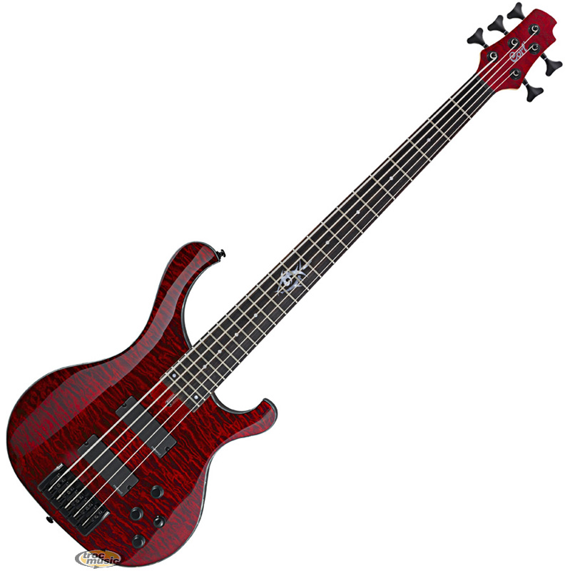 Guitare basse électrique CORT de la série T, modèle 5 cordes. Diapason 35''. Corps acajou avec binding noir perlé. Table érable figuré. Manche érable 3 pièces. Micros EMG-40HZ et EQ 3 bandes EMG. Accastillage noir. Finitions : Trans. Charcoal Gray Wash, Black Cherry.