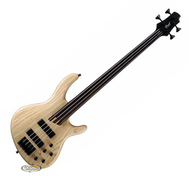 Basse sans frette avec corps acajou, table érable figuré, manche traversant 5 pièces érable/wenge, 2 micros doubles et EQ active Bartolini MK1, Chevalet EB12, mécaniques Hipshot, accastillage alu brossé, naturel pores ouverts.