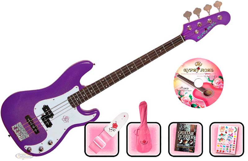 Pack complet guitare basse violet pour filles, taille 7/8, Diapason 625 Mm. Equipée d'un manche plus court et d'un corps moins large. Livré avec housse, sangle, DVD, autocollants, méthode.