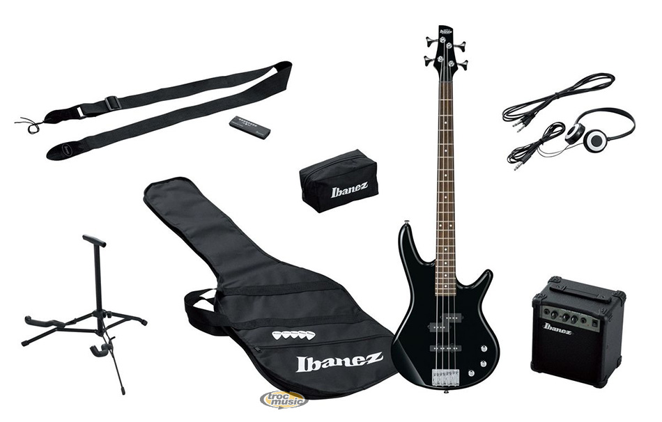 Pack Basse GSR. Kit comprenant amplificateur 10W, accordeur électronique, casque, stand, housse, sangle et médiators .