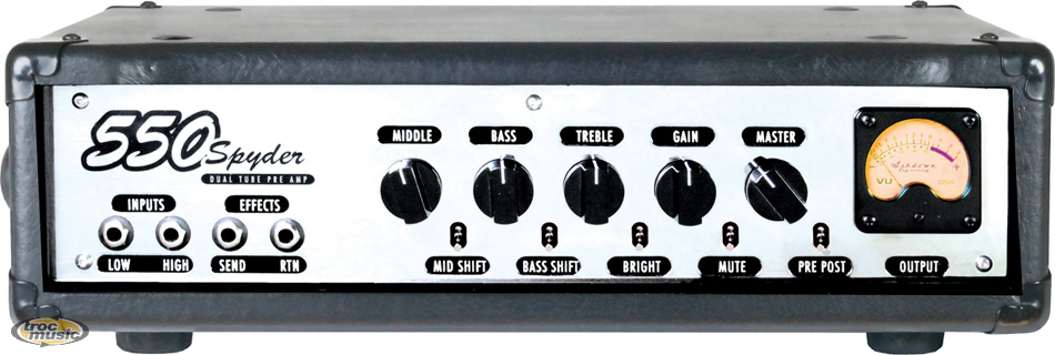 | Le préampli basse Dual Tube d'Ashdown a tout d'abord équipé le 427 Small Block, et il a rencontré un succès immédiat, grâce la profondeur, la présence et la précision du son qu'il offrait. Il équipe maintenant une série d'amplis à laquelle il à donné son nom. Pré-ampli à lampes, 1 x ECC83 1 x ECC82 avec entrées haute et basse impédance. Contrôle du gain, du master, et eq. 3 bandes. Ampli de puissance 550W. Sorties : haut-parleur mini 4 O et DI symétrique. Boucle d'effets. |