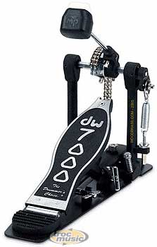 Pédale grosse caisse, charnière aluminium, poulie du ressort sur roulement à billes, guide simple chaîne centré.