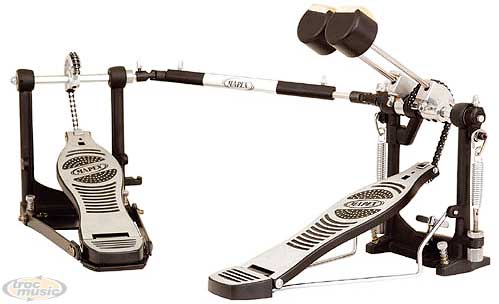 Pédale double grosse caisse, simple chaîne, batte bi-tonale.