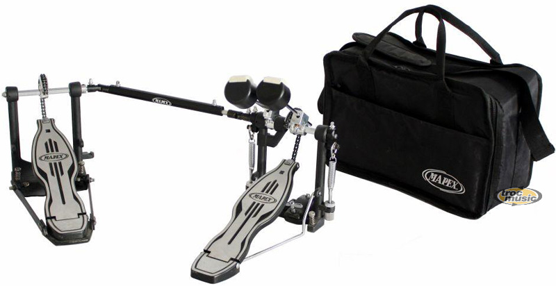 Double pédale de grosse caisse. Transmission par chaîne. Tension des ressorts réglable. Battes double face. Livrée en housse.