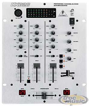 Mixeur DJ 3 voies, compteur BPM auto et contrôle par VCA.