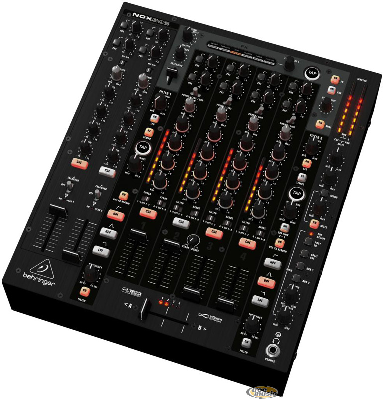 | Table de mixage DJ 6 canaux. Égaliseurs 4 bandes asymétriques. 2 préamplis micro XENYX avec égaliseurs correctifs et 4 préamplis phono. 6 entrées ligne, entrée USB, 4 entrées phono/ligne et 2 entrées micro/ligne. 2 départs Aux stéréo. 2 sorties mix symétriques sur XLR. Section de monitoring balance mix to Cue et touche post-égaliseur. |