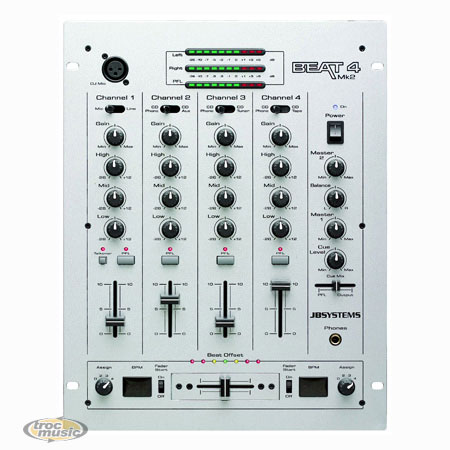 Table de mixage professionnelle 4 canaux. Double compteur des beats avec assignation du canal et des témoins de synchronisation. 11 Entrées (1 micro, 3 phono, 7 line).