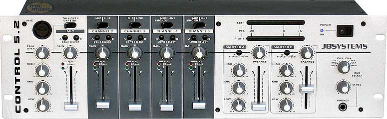 Mixage 2 zones, 11 entrées sur 5 voies avec réglage gain et assignation zone (A et B) + LED C, 2 phonos 4 lignes 5 micros dont DJ avec talkover réglable et égaliseur 3 bandes, 2 masters avec réglage balance et égaliseur 3 bandes + switch stéréo ou mono, sorties symétriques sur XLR ou RCA.