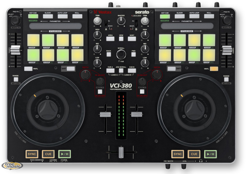 | Le VCI-380 est un 2 en 1, contrôleur MIDI et table de mixage indépendante. Contrôleur MIDI USB 2 voies pour Serato ITCH. Interface audio 24bit/48kHz. 2 x 8 Pads sensibles à la vélocité. 5 Modes de fonctionnement (Hot Cue, Loop Auto, Slicer , Roll, Sampler). PAD FX fonction. Contrôles d'effets par voies. Ruban (strip) de contrôle pour les paramètres d'effet et Needle Drop. Larges jog s de 13,5 cm avec affichage de la position de lecture par led. 2 voies de Mixage autonome avec entrée Phono / Line. Filtre passe-haut, égaliseur 3 bandes, Trim en mode stand-alone mixeur. 2 Entrées micro avec réglage du volume. Sortie Master symétrique (XLR) et 2eme sortie indépendante Booth (RCA). |