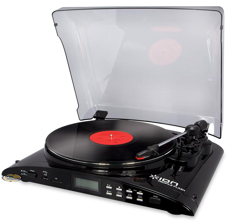 Platine vinyle Ion avec lecture et enregistrement direct sur carte SD et clé USB. Ordinateur non requis. Couvercle de protection. Gestion du bras semi-automatique. Sortie RCA niveau ligne pour chaîne Hifi. Entrée ligne pour récupérer d'autres sources audio (K7, CD...) .
