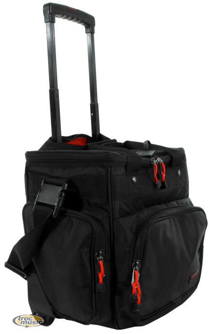 Trolley de 65 vinyles avec rangement laptop et accessoires DJ. Fabrication robuste avec matériaux de qualité. Protections intérieures amovibles ultra-fines (1.5 cm). 1680D Ballistic Nylon. Roues de roller PU et poignée trolley solide. Compatible bagage à main. Compartiment pour ordinateur portable jusque 15''. Dimensions extérieures : 42 x 46 x 30 / intérieures : 30 x 33 x 21. Finition black/black ou black/red.