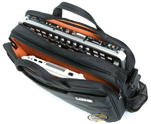Sac pour Controleur VESTAX VCI 300 ou VCI 100. Résistant à l'eau. Compartiment pour ordinateur portable 17' max. Sangle très confortable amovible, 2 poignées confortables. Système pour s'adapter à un trolley. Couleur noir - Intérieur orange. Dimensions : 47 x 37 x 15 cm: 1,3 Kg.