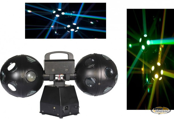 | Double sphère avec rotations sur 2 axes pour un effet impressionnant. Idéal pour toutes sortes d'applications : discothèques, clubs, DJ itinérants... Livré avec un sac de transport. Rotation continue sur 360°. Vitesse de rotation réglable. Micro incorporé pour animations des couleurs. 4 LEDs de 3W RVB 3in1. Alimentation : 100-240V AC, 50/60Hz. Consommation max : 11W. Dimensions : 203mm x 546mm x 292mm; Poids : 4 Kg. |
