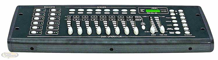 Contrôleur DMX 192 canaux pour 12 effets de 16 canaux, 8 faders (page A de 1 à 8 + page B de 9 à 16 soit 192 canaux). Utilisation manuelle ou entièrement programmable. 240 Scènes (30 banques de 8 scènes).