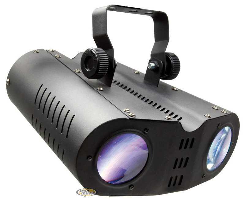 Projecteur à leds double flower, multifaisceaux. Fonctionne au rythme de la musique. Angle de couverture: 66 degrés. Poids: 3,3 kg. Dimensions: 282mm x 279mm x 149mm.