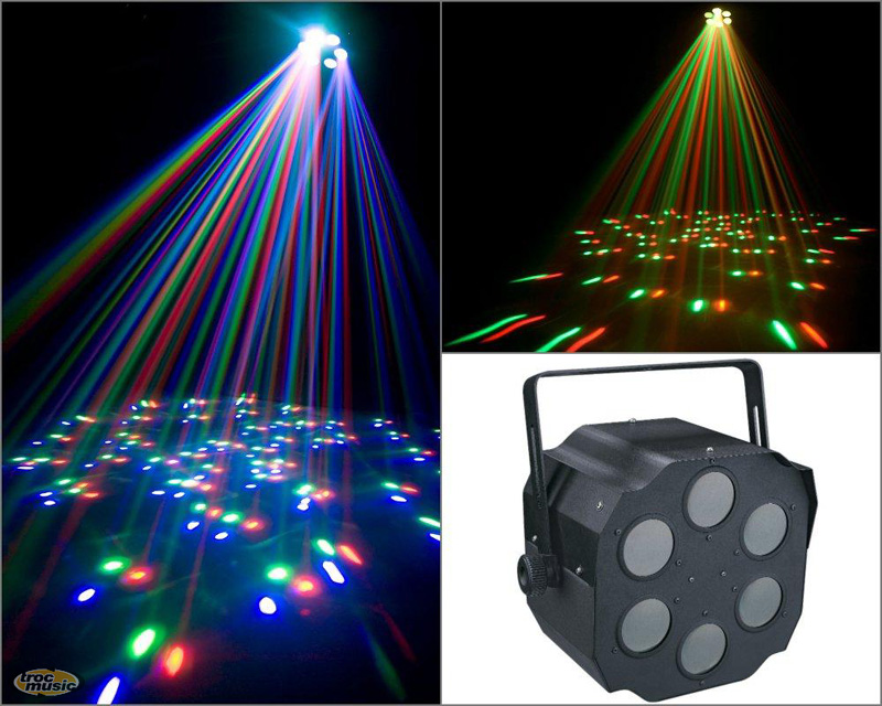 | Effet psychédélique RGBW. Contrôle individuel des couleurs (rouge, vert, bleu et blanc). Mode manuel, auto ou maître/esclave. Micro incorporé pour activation musicale des programmes. 5 canaux DMX. Couverture totale de 71°. Alimentation : 100-240V AC, 50/60Hz. Consommation max : 22W. Dimensions : 175mm x 320mm x 310mm. Poids : 3.5 Kg. |
