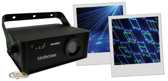 Laser Bleu et Vert + Scan + Gobos. 2 sources laser : Bleu 300 mW/473nm + Vert 60 mW/532nm. Moteur pas à pas haute vitesse. Déplacement XY des faisceaux. Mode musical, Auto et Maître/Esclave. Classe 3B. Alimentation : AC 110V-240V,50/60Hz. Consommation : 25W. DMX: 9Ch. Dim.: 321x268x163mm. Poids : 4.35Kg.