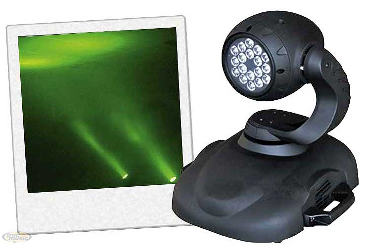 Lyre mono-bras à Leds haute puissance. 18 LEDs de 1W procurant un faisceau très lumineux de type Wash. Trichromie RGB. Effet strobe réglable.