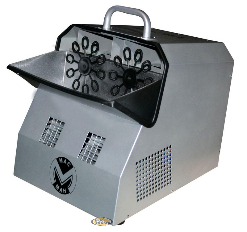 Machine bulles à gros débit avec télécommande Hf. 2 roues à bulles. Capacité réservoir 2.5 litres. Projection environ 7m. Débit bulles environ 500m3. Voltage 230/250V 50/60Hz. Consommation 300W. Dimensions (mm): 450 x 390 x 410. Poids: 13.5kg.