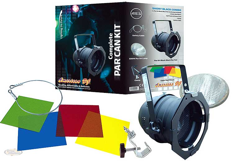 Pack complet comprenant : 1 Projecteur PAR 64 LONG, 1 lampe PAR 64 - 500 W/220V, 4 gélatines 4 couleurs + porte filtre, support avec crochet de fixation, elingue de sécurité, projecteur cablé (fiche secteur STANDARD).