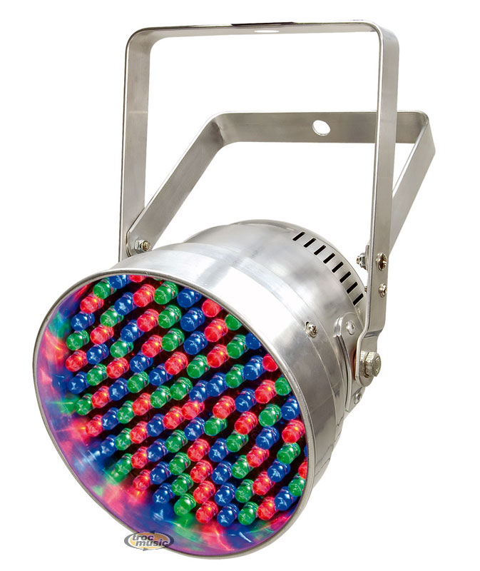 PAR56 de 108 LEDs Chrome. Puissance de LED : 0,25W. Type : RGB 10mm. LUX : 1390@1m. Ampérage : 20mA. Canaux DMX : 3 ou 7. Nombre reliable : jusqu'` 37. Poids et volume : 1,2kg - 194 x 208 x 302mm.