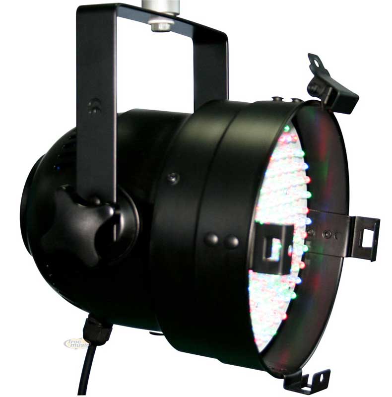 Projecteur PAR56 à LED RGB ( 151 LEDs 51 rouges, 51 bleus et 49 vertes ). Mode de fonctionnement: DMX 5 canaux (in/out XLR), maître/esclave, musical, automatique.