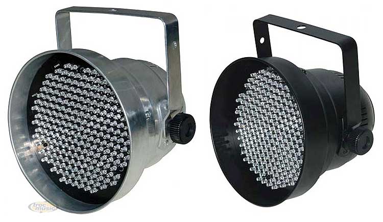 Par 64 à LED RGB DMX. DMX 4 canaux. 212 LEDs : 70 rouges, 71 bleues et 71 vertes. Faible conso électrique. Idéal pour ambiance. Finition Noire ou Chrome.
