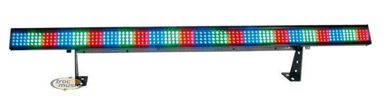 Rampe de 384 Led. 4 canaux DMX-512 LED RGB. Blackout/statique/dimmer/strobe. Contrôle des LEDs avec ou sans DMX. Etudié pour fonctionner en programme automatique maitre / esclave ou DMX. Source de lumière: 384 LED (128 Rouges, 128 vertes, 128 Bleues). Poids: 2kg. Dimensions: 965mm x 64mm x 152mm.
