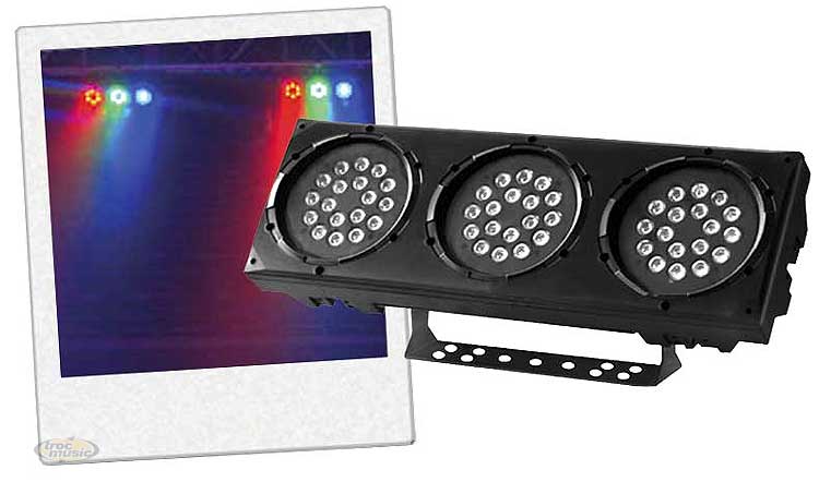 Rampe de 3 modules LED DMX 12 canaux (3 x 4) RGB 54 LEDS DE 1W (high power) 18 rouges 18 vertes 18 bleus (3x6RGB par module), angle faisceau 30°. Applications multiples: architecture, décoration, effets scènes, spectacles ou night-clubs, peut s'utiliser aussi en extérieur (protection d'étanchéité IP65).