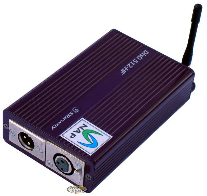 Emetteur / récepteur DMX 512 HF. 2 fréquences de transmission (915 MHz et 433 MHz) sélectionnable par Dipswitches, portée 120 M. en zone dégagée. Possibilité d'utiliser 1 émetteur et plusieurs récepteurs. Alimentation via transformateur 9 V fourni. (NB: pour un système complet il faut 2 DisD 512 HF). Dimensions (L x W x H): 170x86x200 (mm). Poids: 0.7 Kg.