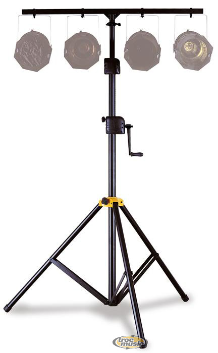 Support lights avec manivelle EZ, tubes légers tout aluminium, sommet du trépied en métal et barres de maintien des pieds doublées, barre acier en T avec clip, conception en 3 parties pour un rangement compact et une meilleure stabilité à hauteur maximum (hauteur : 164 - 350 cm, poids : 10.2 kg, charge supportée : 45 kg).