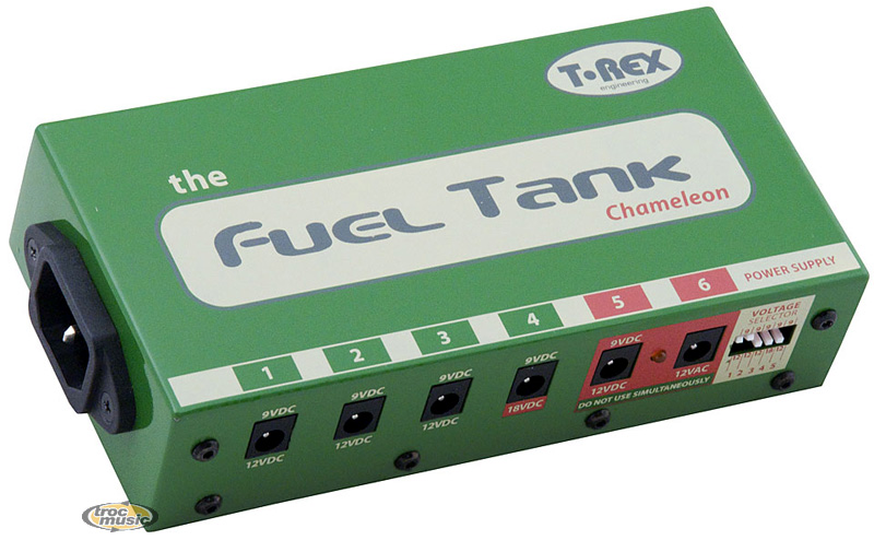 | L'alimentation multi-pédales Fuel Tank Chameleon de chez T-Rex Engineering est la solution idéale pour faire fonctionner plusieurs pédales sans avoir à collectionner les alimentations. 6 sorties séparées sont disponibles (dont 5 utilisables en simultané). Elles sont isolées et font 300mA. La Fuel Tank Chameleon permet également de choisir le voltage que vous désirez (9V DC, 12V DC, 18V DC ou 12V AC), et est switchable en 115V et 230V. |