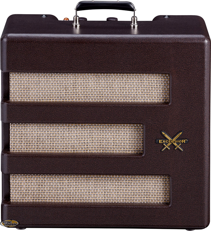 | Combo à lampes look retro vintage. Doté d'une puissance de 13 Watts, l'Excelsior intègre un HP de 15'' Special Design, 2 lampes 6V6 et deux lampes 12AX7. Sur son panneau de contrôle situé sur le dessus, on trouve 3 entrées (guitare, micro et accordéon) qui bénéficient chacune d'un circuit spécifique optimisé. L'Excelsior est également doté d'un circuit Tremolo dont on peut ajuster la vitesse, d'un sélecteur '' bright/dark '' pour booster les basses ou les aigus, d'un bouton de volume et d'une sortie 1/4 qui déconnecte le HP interne pour envoyer le signal vers un cabinet externe. |