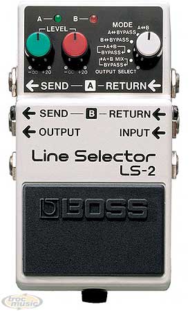 Pédale sélecteur de ligne: permet d'alterner entre divers effets ou amplificateurs ou d'acheminer des signaux d'entrée et de sortie. Peut alimenter plusieurs pédales BOSS via un seul adaptateur secteur.