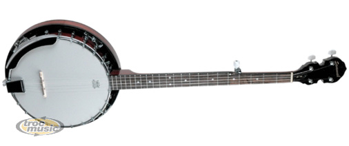 Banjo 5 cordes, modèle pour gaucher. Caisse acajou. Peau Remo. Manche acajou. Touche palissandre 19 cases. Chevalet érable + ébène. Accastillage chromé.